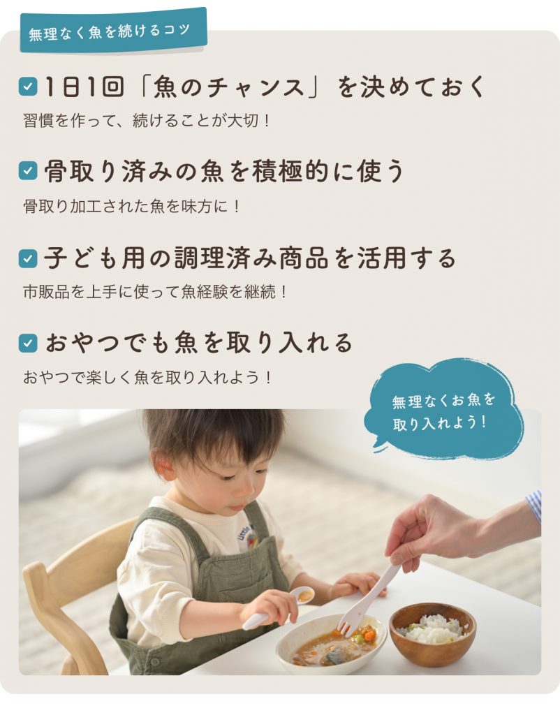 味覚が広がる乳幼児期にしっかり魚と食べることで、自然とお魚好きになりやすい土台が作られるということですね。
