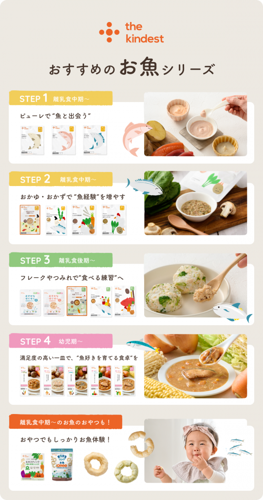 家庭で魚を続けるためには、”月齢に合わせた形”で魚に触れ続けることがとても大切です。the kindest のお魚アイテムは、離乳食デビューから幼児期まで、幅広いラインナップをご用意しています。
