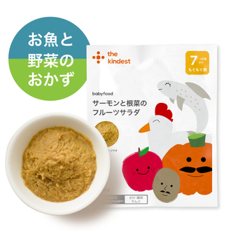 離乳食期に積極的に食べたいサーモンを、じゃがいも・かぼちゃ・りんごと合わせ、ほんのり甘いマッシュサラダ仕立てにしました。 サーモンは低温でじっくり焼くことで、旨みを残しながらも余計な脂を落とし、食べやすくしました。 りんごは甘みの強い品種を選んでいるので、クリーミーな中にも甘さが引き立つひと品です。 離乳食初期からのステップアップ中のお子さまにおすすめです。 ※時期によって有機野菜を仕入れられないことがあります。その際には国産野菜を使用します。