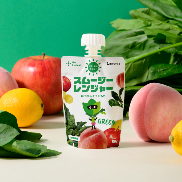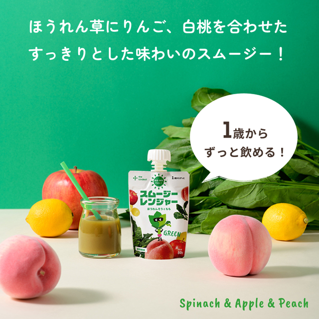 白砂糖や香料を使用せず、白桃の甘い香りと、りんごのやさしい酸味でほうれん草の青みをおさえ、お子さまでも飲みやすい風味に仕上げました。