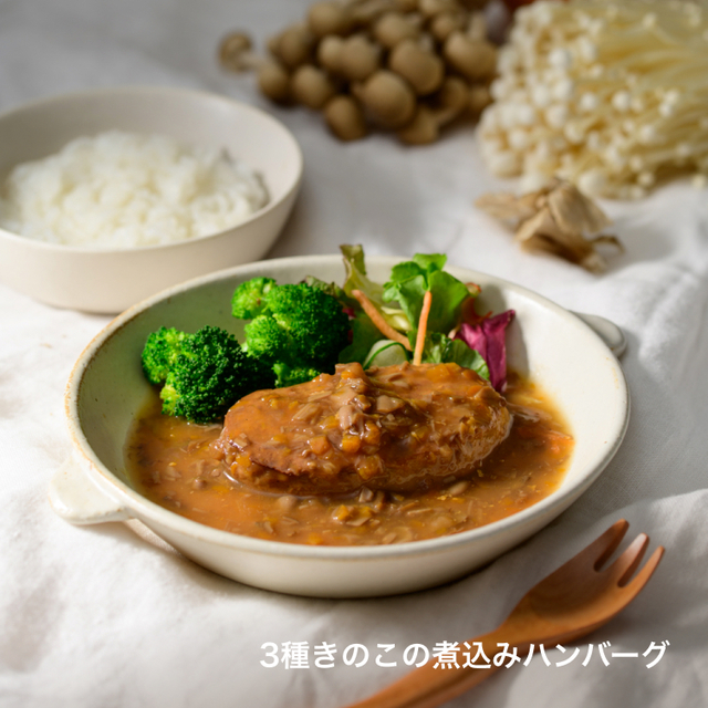 国産の鶏肉・豚肉と豆腐を合わせてふんわり仕上げたハンバーグを、和風デミグラスソースで煮込みました。 国産の3種類のきのこの味わいも楽しめる、食べ応えのあるハンバーグです。 複数の出汁や野菜のうまみの相乗効果と、赤ワインの代わりに使用した隠し味の100%赤葡萄ジュースのコクで、本格的な一品に。