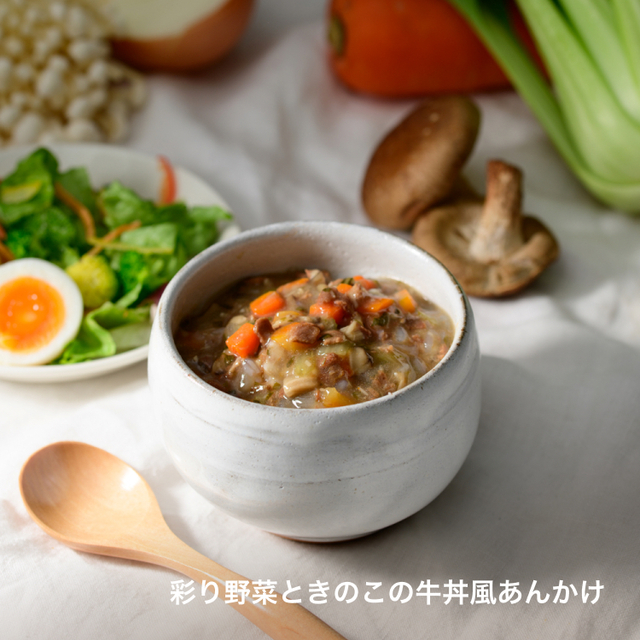 国産牛と国産野菜・きのこがたっぷり入った、牛丼風のあんかけです。