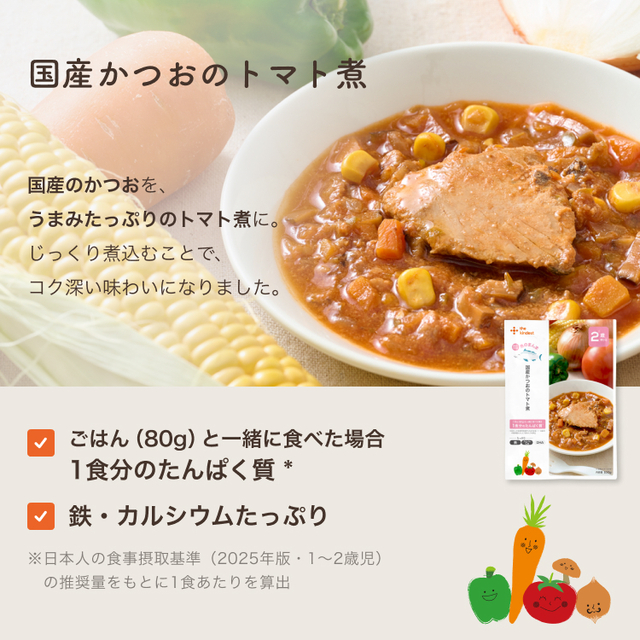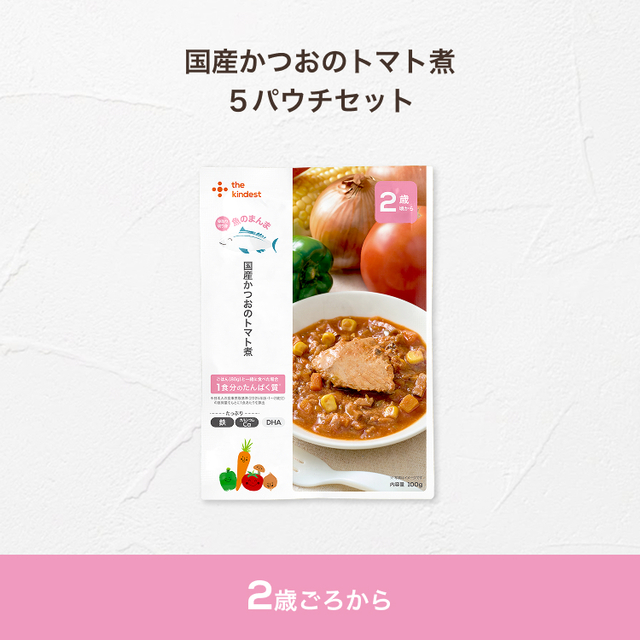 野菜(にんじん、玉ねぎ、とうもろこし、ピーマン)、かつお(国産)、トマトピューレ、ミックス野菜ソテー(玉ねぎ、にんじん、セロリ、大豆油)、かつおだし、トマトペースト、米粉でん粉、干し椎茸、食塩、ガーリックパウダー/グルコン酸Ca、ピロリン酸鉄、(一部に大豆を含む)