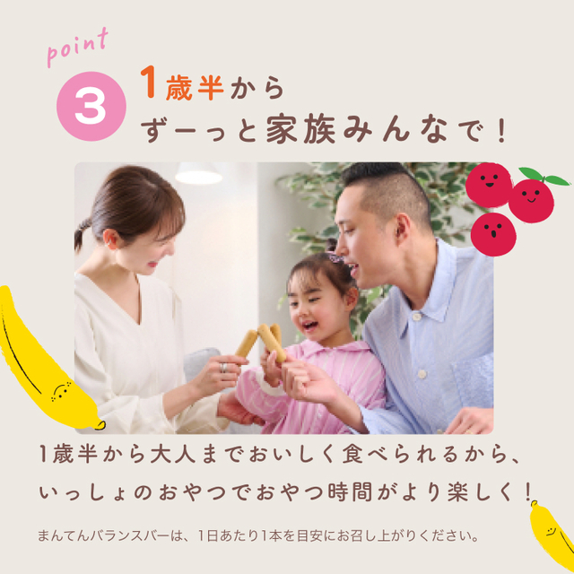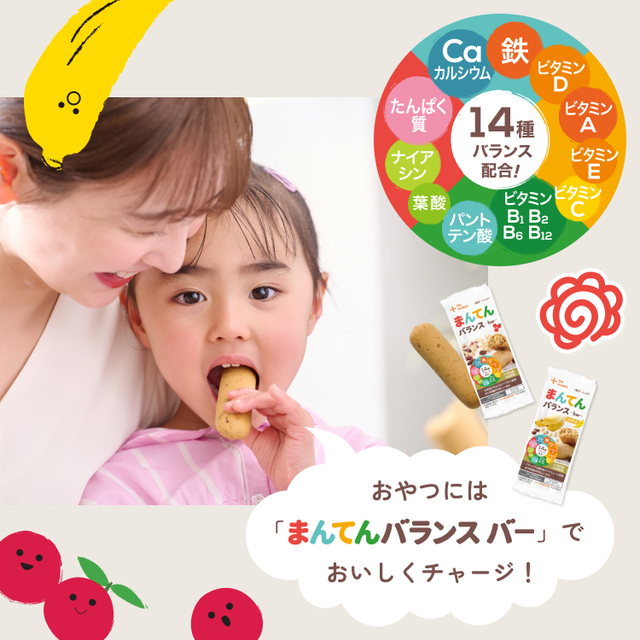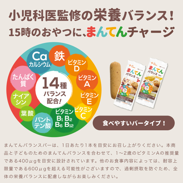 鉄やたんぱく質など、不足しがちな栄養素(14種)をバランスよく配合したバータイプの栄養おやつです。