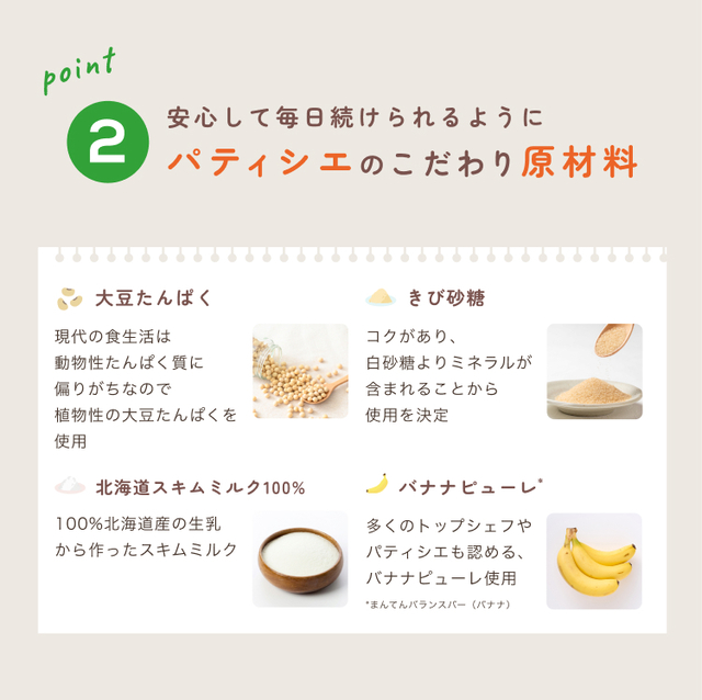 日本人に馴染みのある大豆たんぱくをはじめ、パティシエセレクトの原材料をふんだんに使用。甘さ控えめのやさしい味わいに仕上げました。